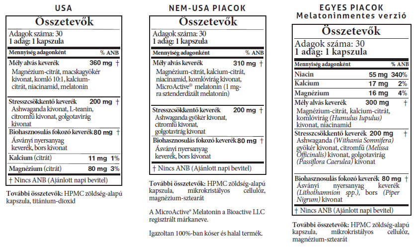 A mély alvásért felelős adalék magnézium-citrát, Valerianagyökér kivonat, komló, kalcium-citrát, niacainamid, melatonin. Ezek az összetevők segítenek az agy és a test éjszakai megnyugtatásában, hogy reggel kipihentnek érezzük magunkat.